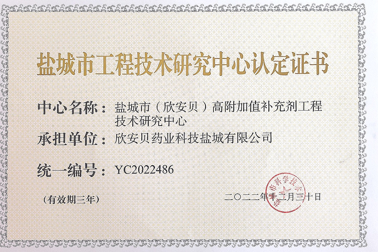 鹽城市工程技術(shù)研究中心認(rèn)定證書(shū)
