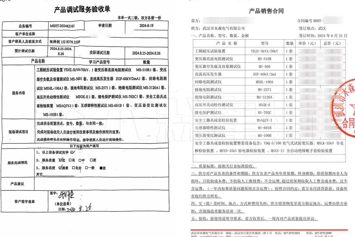 此次驗收的單位是四川XX科技有限公司,試驗地點在眉山市東坡區(qū)齊通路西四段。四川客戶采購設(shè)備包括:工頻耐壓試驗裝置YDJZ-5kVA/50kV、變壓器直流電阻測試儀 MS-510R 、變壓器空負載及容量測試儀MS-560、直流高壓發(fā)生器 ZGF-60kV/2mA1套、回路電阻測試儀MSHL-100A、繼電保護測試儀 MS-702C、安全工器具成套檢驗裝置 MSAQJY-I 1套等合計14套設(shè)備。在調(diào)試過程中,設(shè)備供應商木森電氣派遣了資深電氣試驗人員沈工負責,嚴格按照設(shè)備的技術(shù)標準和操作規(guī)程進行工作。沈工首先對設(shè)備進行了全面的檢查,確保各部件連接無誤、功能正常。隨后,依據(jù)設(shè)備的調(diào)試方案,逐步對各項功能進行測試和校準,確保設(shè)備在各種工況下都能穩(wěn)定運行。
